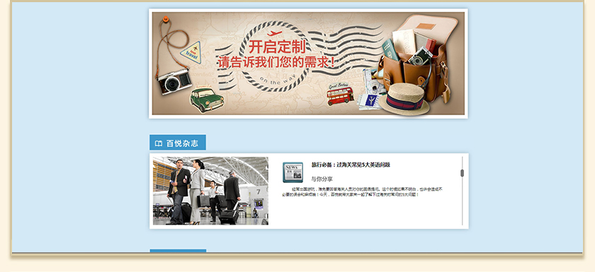Project Description 百悦逸游于2012年初由二位资深的旅行家创办,是成都传媒集团旗下成都新闻国际旅行社有限公司的高端旅游品牌,总部位于成都高新区天府大道中段美年广场。在百悦逸游成立之前,创始团队亲自到全球三十多个国家实地考察,带着第一手的资讯和执着的信念创立了中国西部第一家真正意义上的私人定制旅行机构。百悦的旅行不是跟团挤大巴,不是十天去十个国家,更不是没完没了的... Official website address 鸡西http://www.100.travel I want to share